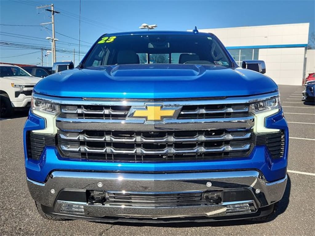 New Price! CARFAX One-Owner. Glacier Blue Metallic 2023 Chevrolet Silverado 1500 LTZ 4WD 10-Speed Automatic EcoTec3 5.3L V8 ONE OWNER!, 10-Speed Automatic, 4WD, Gideon/Very Dark Atmosphere Leather.